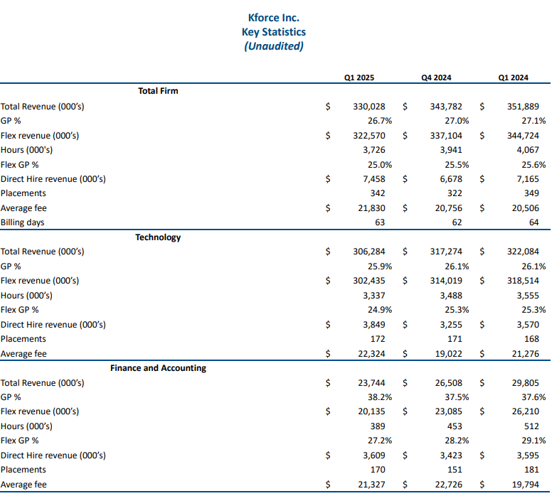 (May 3.): On April 28th Kforce (KFRC) released their Q1FY25 earnings. Kforce is a staffing service firm specializing in technology, finance and accounting, and other professional services. Their technology revenues is the largest portion of their revenue stream.