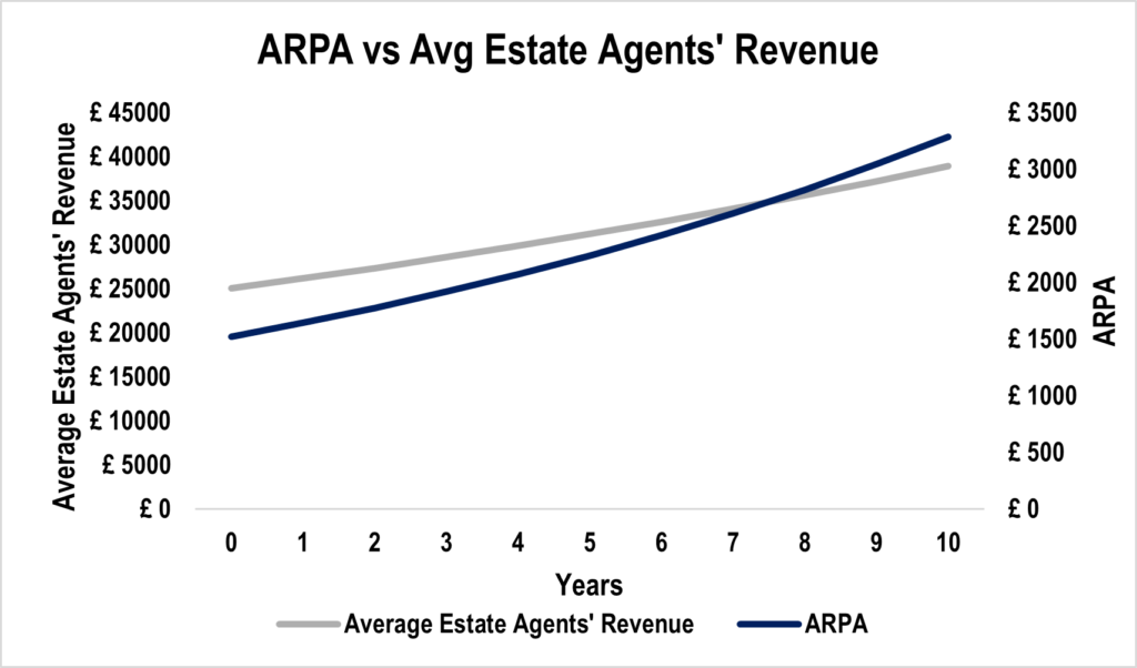 • Average spend of estate agents to Rightmove as a percentage of estate agents’ average revenues at the 10th year assuming previous growth rates in ARPA and estate agents’ revenues