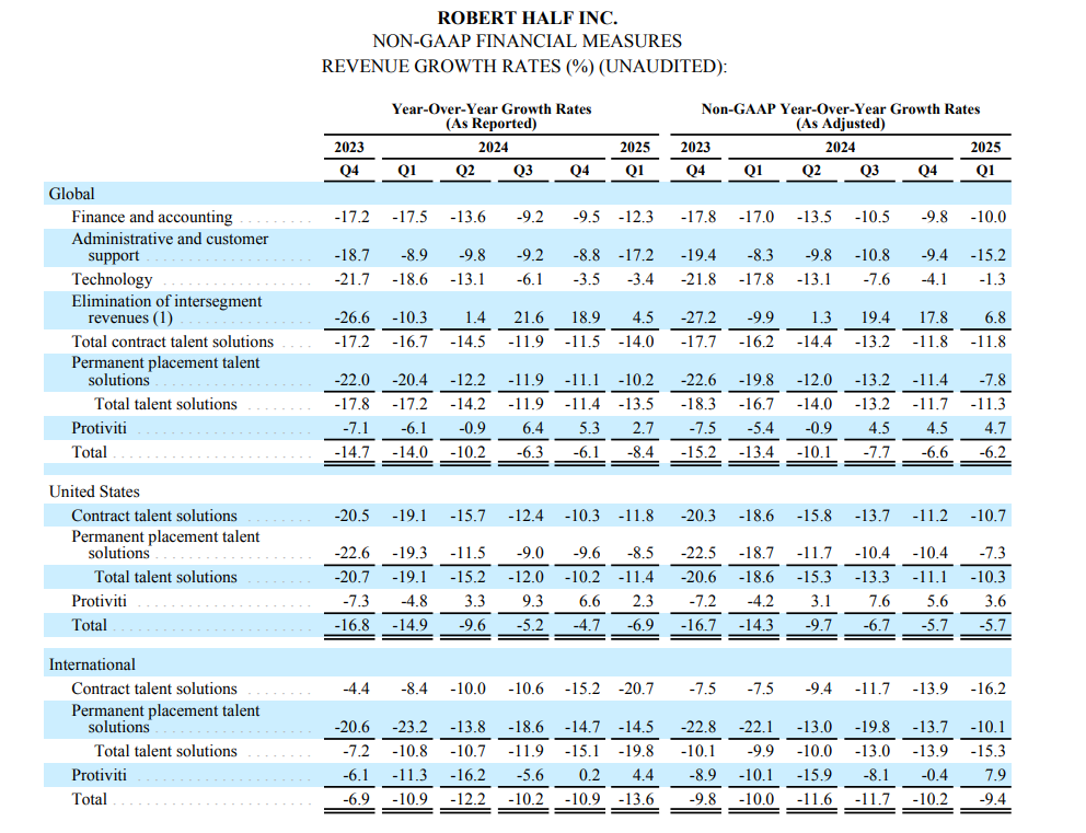 (Apr 27.): Robert Half (RHI) released their Q1FY2025 earnings on April 23rd. Robert Half is a staffing agency that also have a consulting business. Their main focus is in the finance and accounting division. And a majority of their revenues are derived from the NA region.